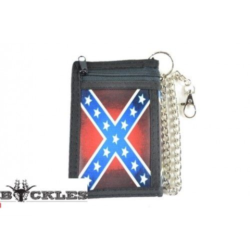 Portafoglio ripiegabile in poliestere resistente con chiusura velcro e dotato di una catena con moschettone in metallo che consente di attaccarlo al passante dei pantaloni per evitare la perdita o lo scippo.