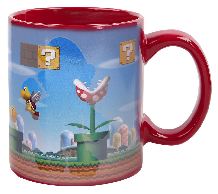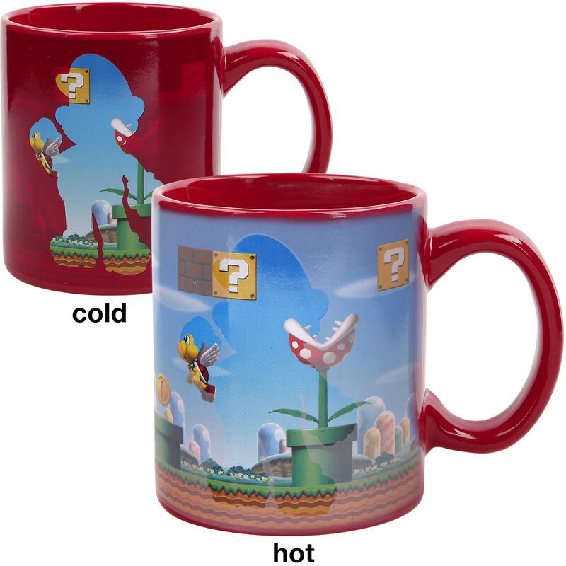 Tazza da colazione Nintendo – Super Mario. Quando la tazza viene riempita da una bevanda calda, l'immagine cambia e mostra il mondo del gioco.