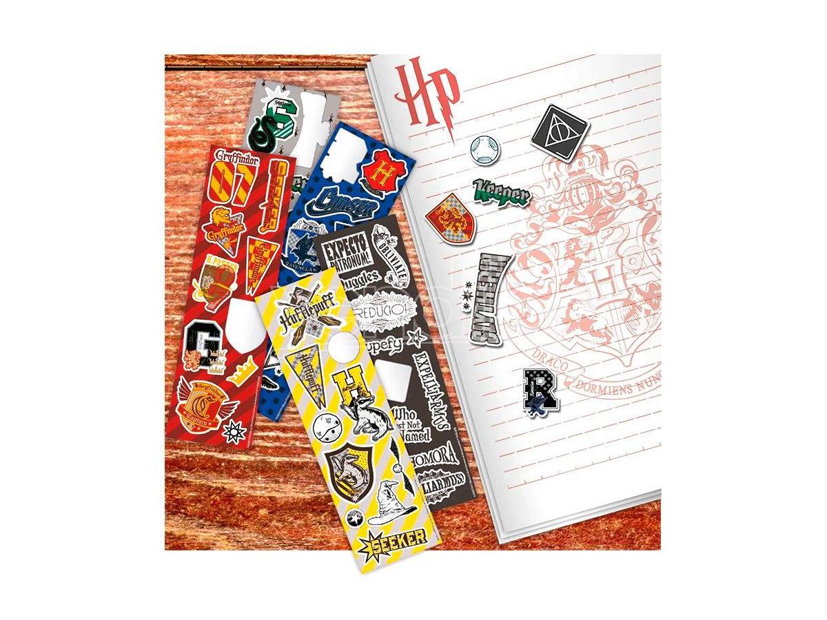 La confezione contiene 50 adesivi delle casate della scuola di magia di Hogwarts divisi in 5 cartelle.