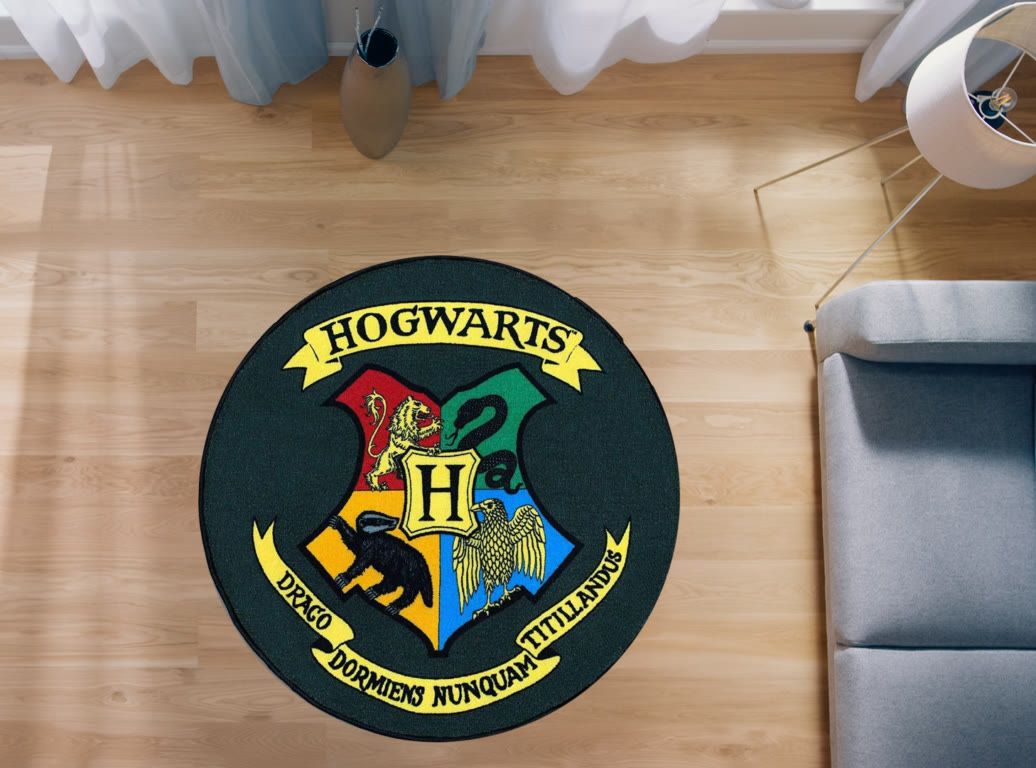 Tappeto rotondo con lo stemma della scuola di magia di HOGWARTS della saga Harry Potter. Diametro 100 cm.